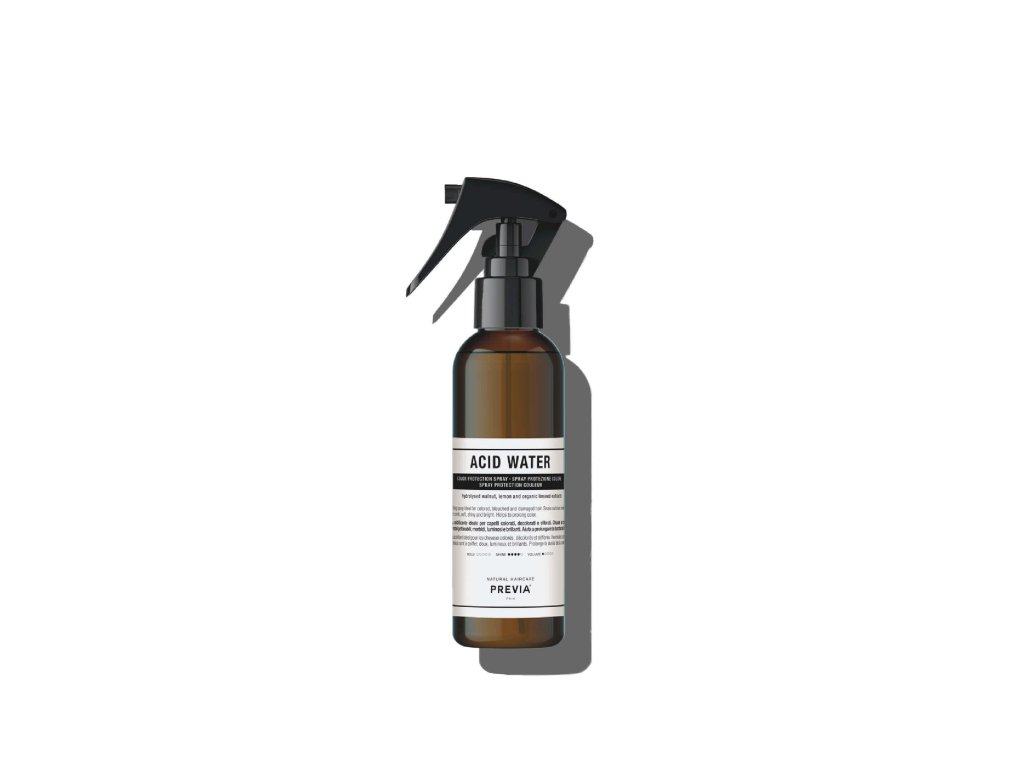 PREVIA Acid Water je profesionální acidifikační sprej určený pro barvené, zesvětlené a poškozené vlasy. Díky kyselému pH uzavírá vlasové kutikuly, fixuje barvicí pigmenty uvnitř vlákna a chrání je před předčasným vymytím. Výsledkem jsou vlasy snáze rozčesatelné, hebké, lesklé a zářivé.