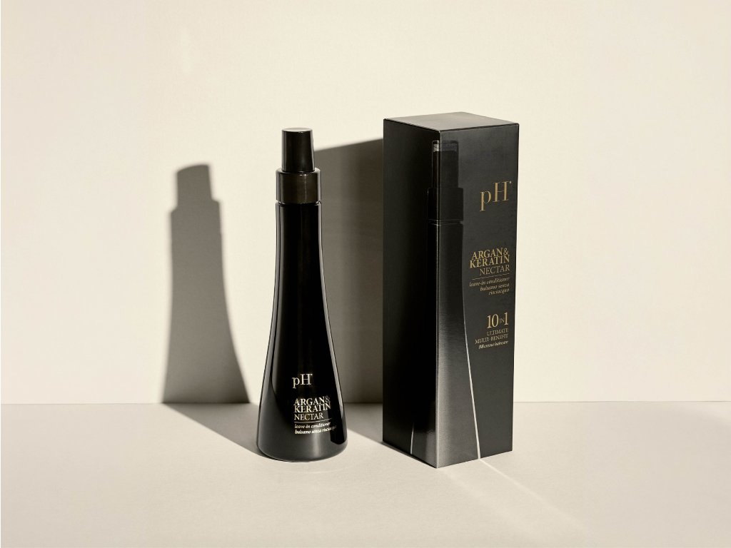 ARGAN & KERATIN NECTAR od pH Laboratories je multifunkční leave-in sprej na bázi kondicionéru, navržený pro intenzivní péči o poškozené, suché a chemicky zatěžované vlasy. Kombinuje sílu arganového oleje a hydrolyzovaného keratinu a nabízí 10 účinků v jednom kroku – hloubkově obnovuje vlasová vlákna, eliminuje krepatění, chrání před tepelným stylingem a UV zářením, zvýrazňuje barvu vlasů a chrání ji před vyblednutím, zabraňuje třepení konečků, dodává vlasům objem bez zatížení, zajišťuje oslnivý lesk, usnadňuje rozčesávání a styling, a zároveň udržuje účes ve tvaru po celý den. Díky bezoplachovému složení působí po celý den a nezatěžuje vlasy.