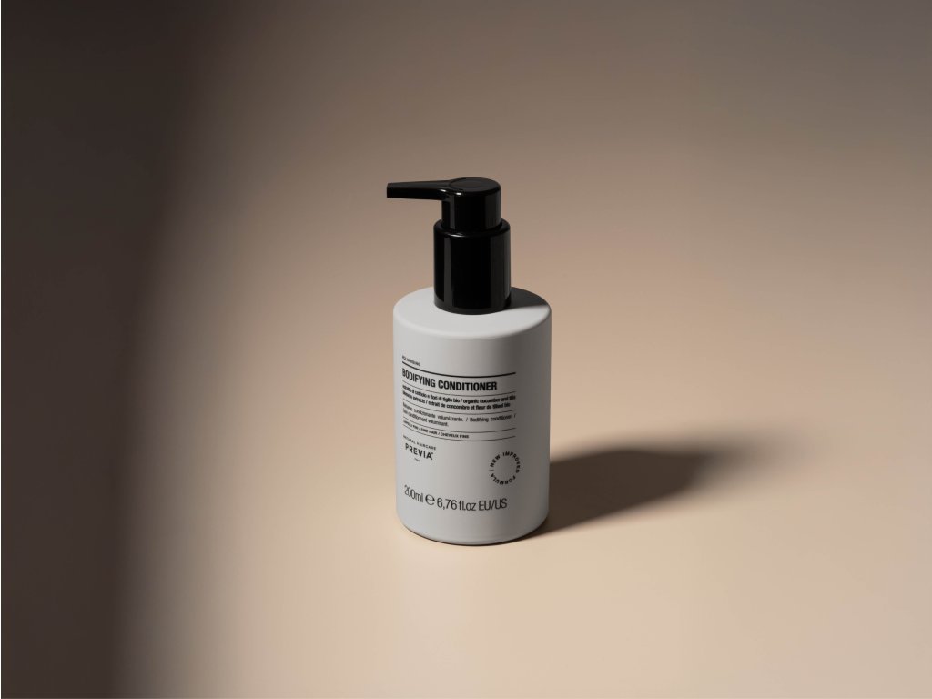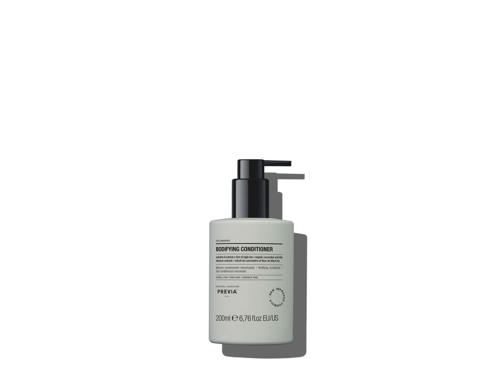 BODIFYING CONDITIONER od italské značky PREVIA Italy představuje špičkovou objemovou péči, která byla vyvinuta tak, aby jemným a křehkým vlasům dodala chybějící texturu a vnitřní sílu. Jeho lehké bio-organické složení okamžitě proniká do vlasového vlákna, kde zvyšuje jeho průměr a pevnost, aniž by vlasy ztratily svou přirozenou nadýchanost nebo zplihly. Kondicionér účinně uzavírá povrch vlasu, čímž zvyšuje jeho celkovou odolnost a dodává mu oslnivý lesk. Výsledkem jsou hloubkově vyživené, poddajné vlasy, které si udržují bohatý objem od kořínků až ke konečkům.
