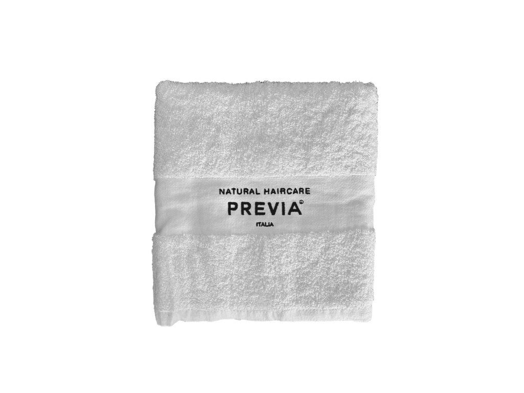 Designu dominuje elegantní bílá barva s precizní černou výšivkou loga PREVIA. S rozměry 100 x 50 cm je ručník ideální pro vytvoření turbanu nebo pohodlné sušení vlasů u mycího boxu.