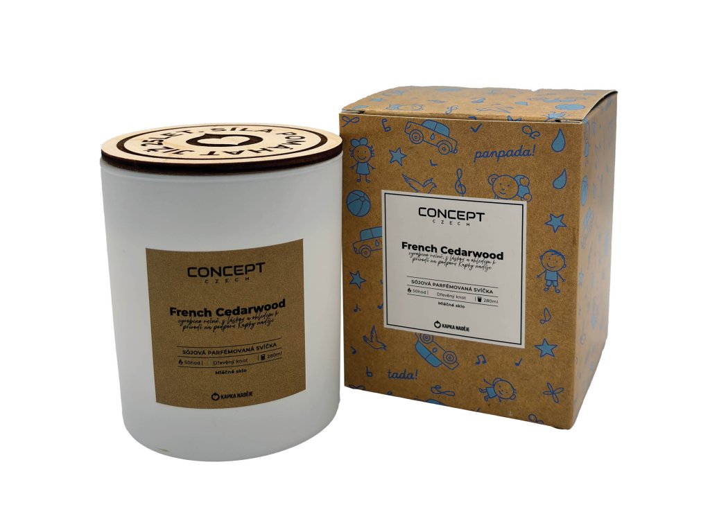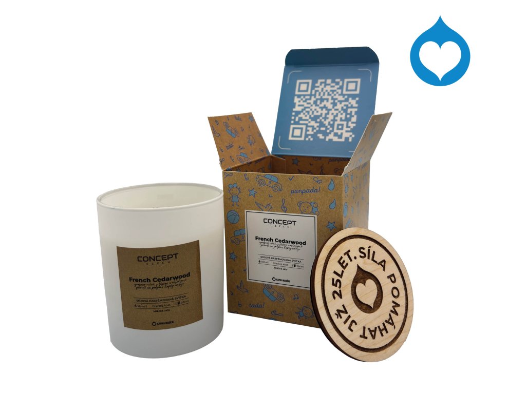Ručně odlévaná sójová svíčka s vůní francouzského cedru přináší hřejivou, elegantní a dlouhotrvající vůni obohacenou o prémiové silnější parfemace. Dřevěný praskající knot vytváří uklidňující zvuk a až 50 hodin čistého hoření. Každým zakoupeným kusem navíc podporujete Kapku Naděje a pomáháte tam, kde je to opravdu potřeba.