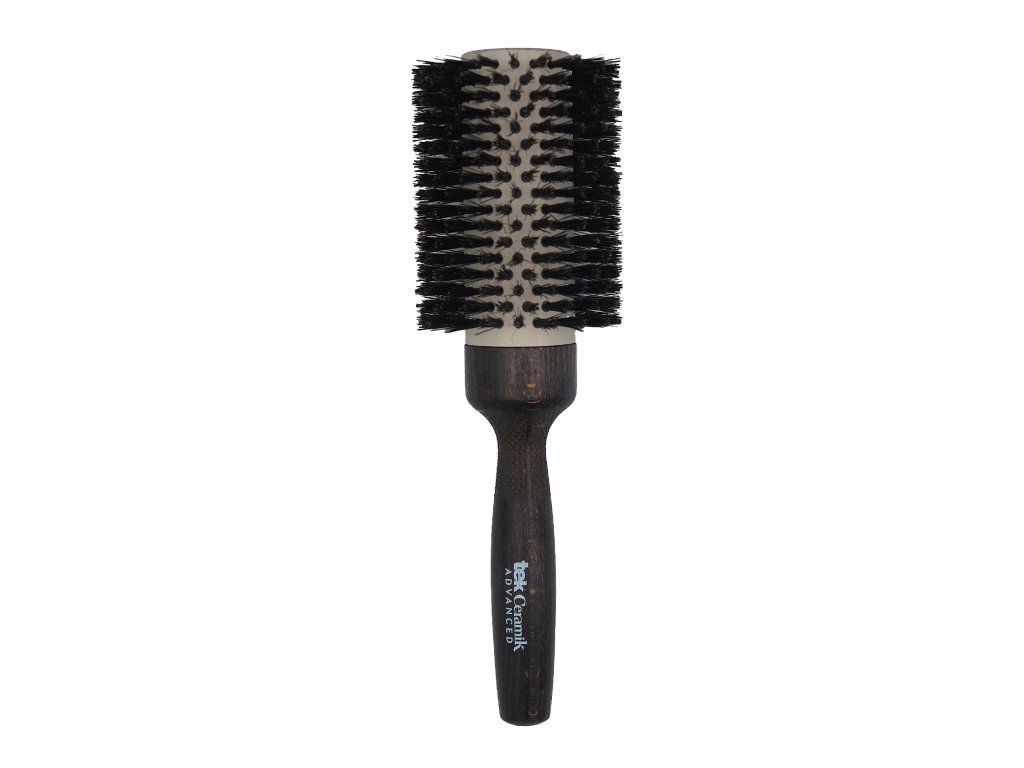 Tek Ceramik Advanced je profesionální kulatý kartáč na vlasy o průměru 70 mm, navržený pro dosažení dokonalého stylingu. Tento vysoce kvalitní kartáč je ideální pro každodenní úpravu vlasů, ať už doma nebo v profesionálním salonu. S kombinací nylonových a kančích štětin poskytuje optimální grip a jemnou masáž pokožky hlavy, což zlepšuje krevní oběh a celkové zdraví vlasů. Kartáč je vybaven pokročilou Tek Ceramik technologií, která rovnoměrně rozděluje teplo a minimalizuje poškození vlasů během stylingu. Ručně vyráběný kartáč z bukového dřeva s certifikací FSC® má průměr 70 mm a zesílené kančí štětiny. Kombinace vysoce kvalitních surovin, ergonomického designu a odolnosti proti vysokým teplotám činí z tohoto kartáče neocenitelného pomocníka. Rukojeť kartáče je opatřena speciálním frézováním „pro-grip“, které zajišťuje pohodlnější a bezpečnější úchop, umožňující lepší kontrolu a snadnější manipulaci při úpravě vlasů. Inovativní ultra jemná struktura je složená ze 75% kančích štětin a 25% antibakteriálního nylonu. Kartáč odolá teplotám až 300 °C a je antistatický. Je vhodný pro dlouhé nebo velmi dlouhé vlasy a pomáhá dodat vlasům hebkost a objem.