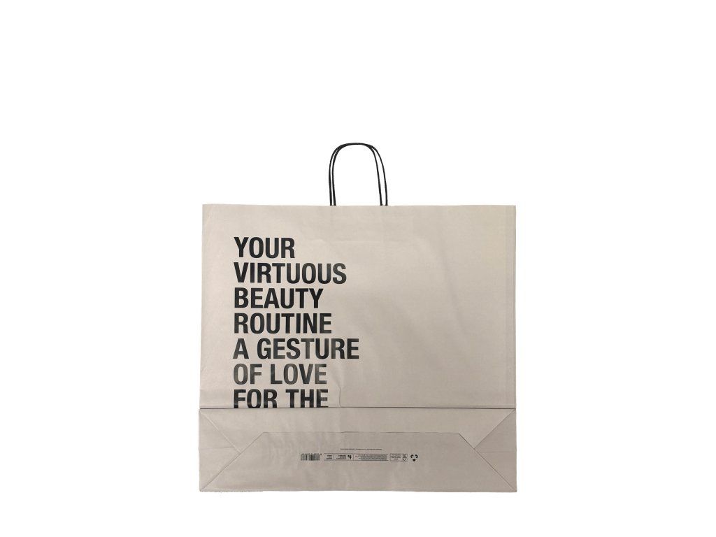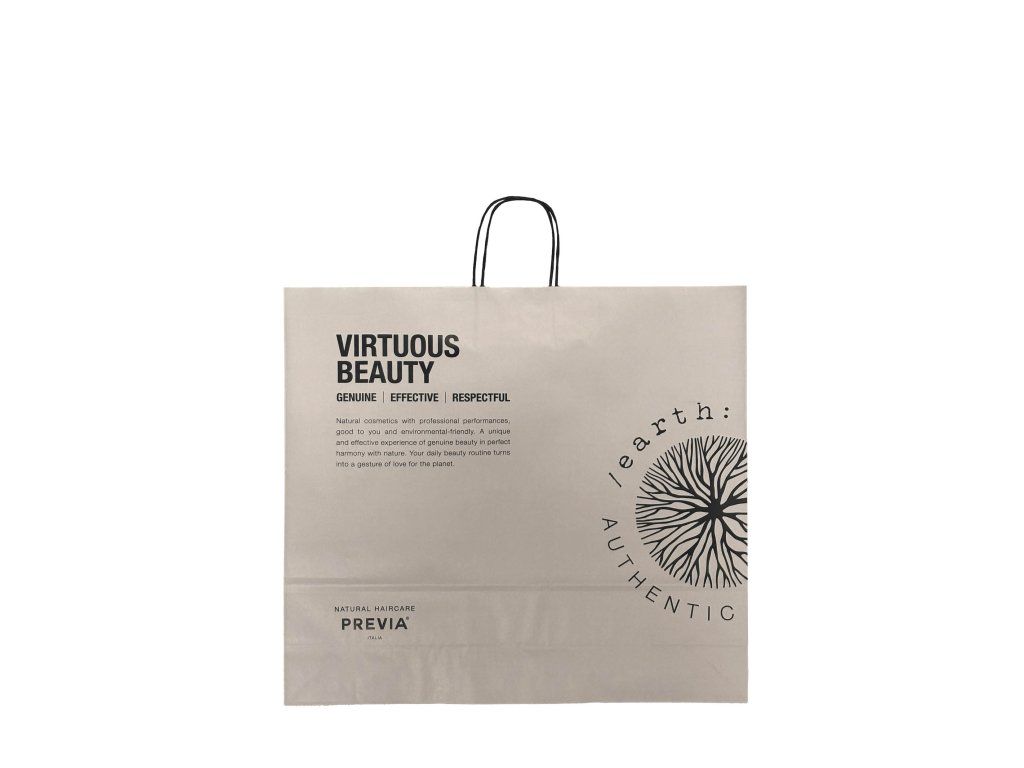 Papírová taška Virtuous Beauty Shopper Bag o velkorysém rozměru 55 × 50 x 15 cm je ideálním řešením pro luxusní dárkové balení nebo odbyt produktů ve vašem salonu. Je vyrobena z pevného papíru, který zajišťuje stabilitu i při větším zatížení. Minimalistické černé logo na bílém či barevném podkladu v kombinaci s černou kroucenou šňůrou dodává balení profesionální a čistý italský vzhled.
